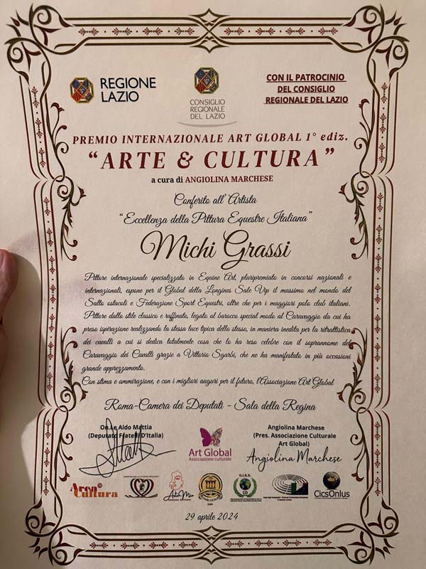 Grande merito dell’attenzione sull’arte equestre rappresentata magistralmente da Michi Grassi va a figure di spicco come l’onorevole Aldo Mattia e suo fratello Gerardo, sempre attivi nel valorizzare le eccellenze italiane nell’ambito della cultura e ad Angiolina Marchese, migliore curatrice di mostre in Italia che vanta un lungo elenco di successi in collaborazione con Vittorio Sgarbi.